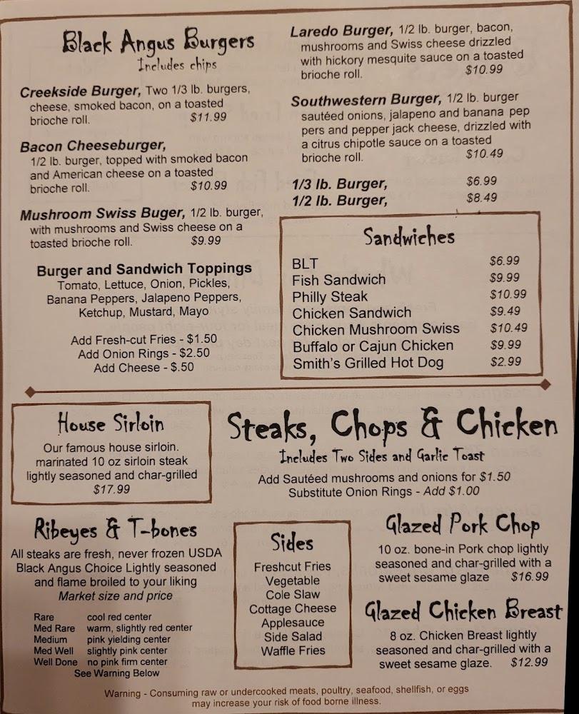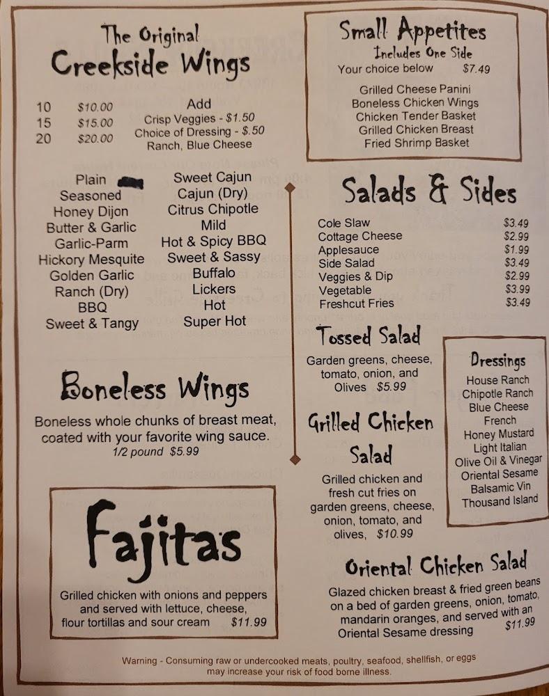 The menu at Creekside Bar & Grille features a vast selection perfect for everyone. Starters include chicken tenders, quesadillas, and veggie options for light bites. The baskets, like fried fish and shrimp, make for hearty meals. Popular entrees include juicy steaks and savory fajitas, reflecting local tastes. Sides like fresh-cut fries and vegetable medleys are perfect companions to any meal.