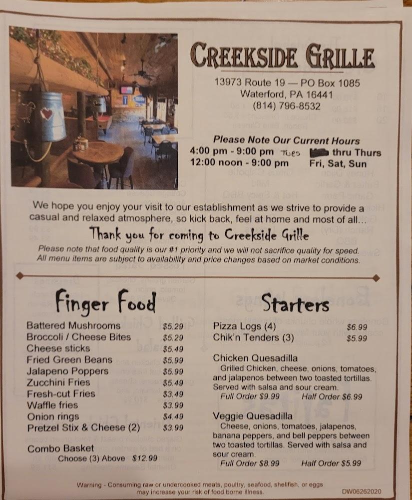 Welcome to Creekside Bar & Grille, your go-to spot in Waterford for delicious grilled meals and refreshing beverages. Located at 13973 US-19, we offer a warm, relaxed atmosphere ideal for solo diners or groups. Enjoy our excellent cocktails and a vast selection of beers while savoring local specialties on our inviting terrace. With accessible seating and amenities, we cater to everyone's needs. Join us for lunch or dinner, and don't miss our happy hour specials! Whether you're in for a quick bite or a leisurely meal, Creekside Bar & Grille promises great food and a pleasant experience for all.